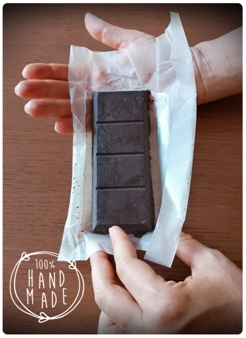 Semplicemente pura pasta di cacao addolcita e aromatizzata, viene lavorata a freddo per non alterare le proprietà organolettiche del cacao, come attesta la patina bianca che avvolge la tavoletta, per essere poi racchiusa in bustina per preservarne il gusto e in un elegante involucro di carta.